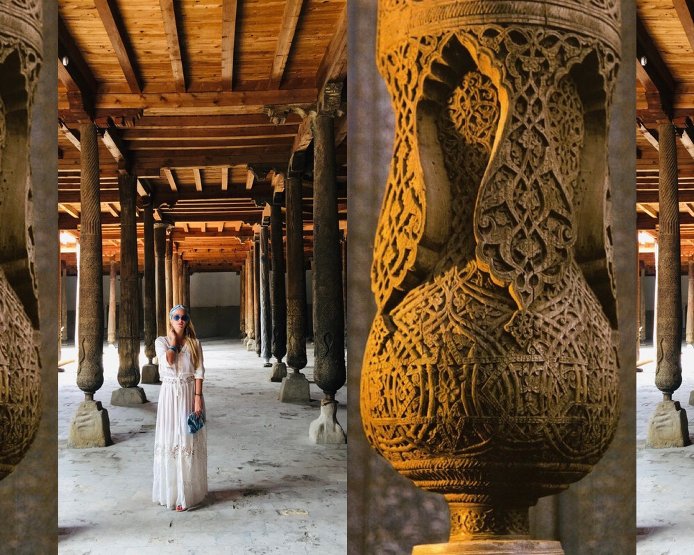 — Мы посетитим одну из самых удивительных мечетей Узбекистана - Джума Мечеть. Её крыша опирается на две сотни деревянных колонн с изящной орнаментальной резьбой и, при этом, рисунки на колоннах не повторяются.